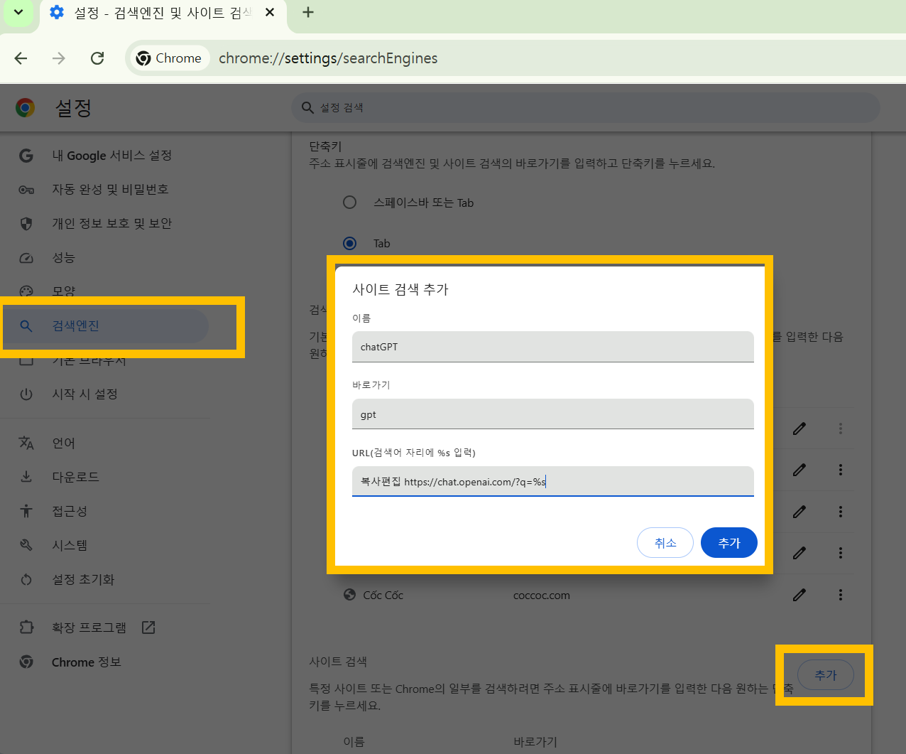 Chrome 검색 엔진에 ChatGPT 검색 단축키 추가