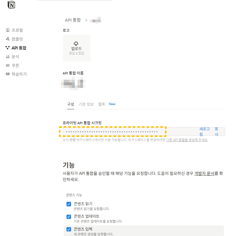 - Notion API 통합 페이지(https://www.notion.so/my-integrations) 에서 API 키 발급