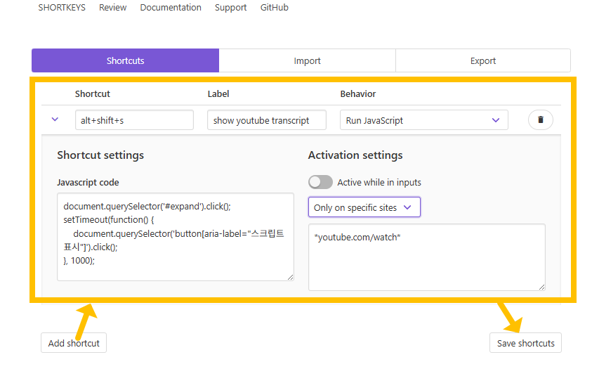 유튜브의 '더보기' 버튼과 '스크립트 표시' 버튼을 차례로 클릭하기 위해 Shortkeys의 자바스크립트 입력란에 아래 코드를 복사하여 붙여넣는다.
